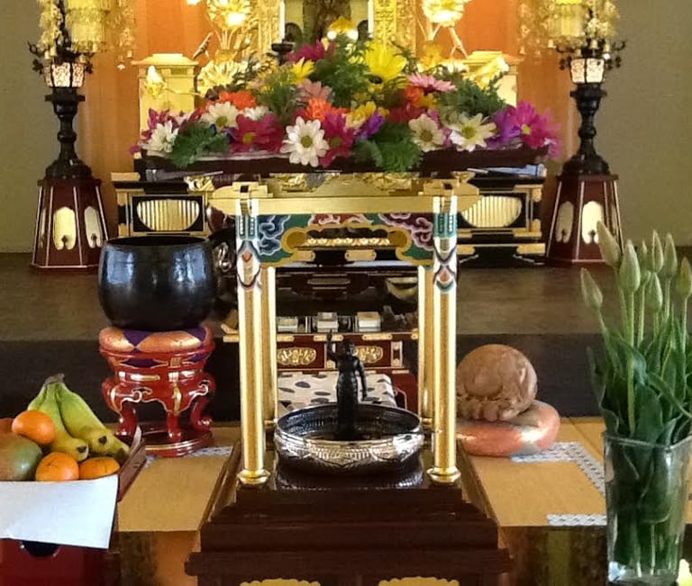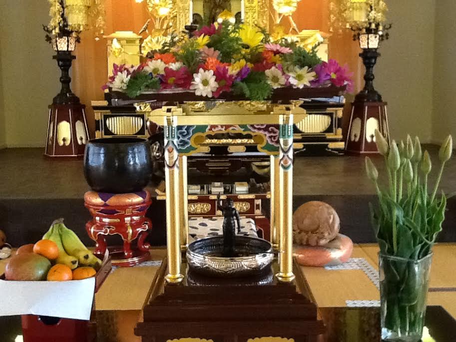 A ceremony is held at Japanese temples in April or May to commemorate the birth of the Buddha, Shakyamuni (O-shaka-sama). During this celebration, a statue of the baby Buddha is placed in a flower-adorned shrine, and participants pour sweet tea (a herbal infusion) over the statue’s head—reenacting the moment when heavenly nectar is said to have descended upon the newborn Buddha.