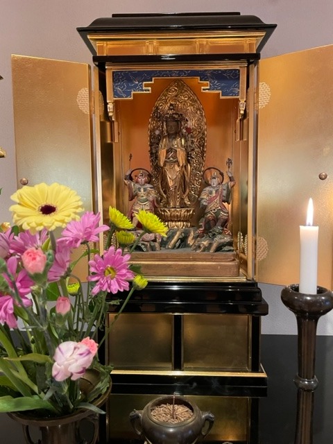 The Kannon of the shrine is a copy of a very famous statue called the “Yanagi-dani Kannon,” (Willow Valley Kannon 柳谷観音) which resides at the above mentioned Yōkuji. This temple was built in 806 by the priest Enchin (延鎮), who had a dream in which the bodhisattva told him that if he went to the hills to the west of Kyoto he would find Kannon in person. Thus directed, Enchin traveled to a valley thickly grown with willows and found the bodhisattva in the eleven-faced, thousand-armed, thousand-eyed form standing on a rock. He soon built a temple to venerate this bodhisattva but his duties as abbot of Kiyomizu Temple in Kyoto called him back to the city.
