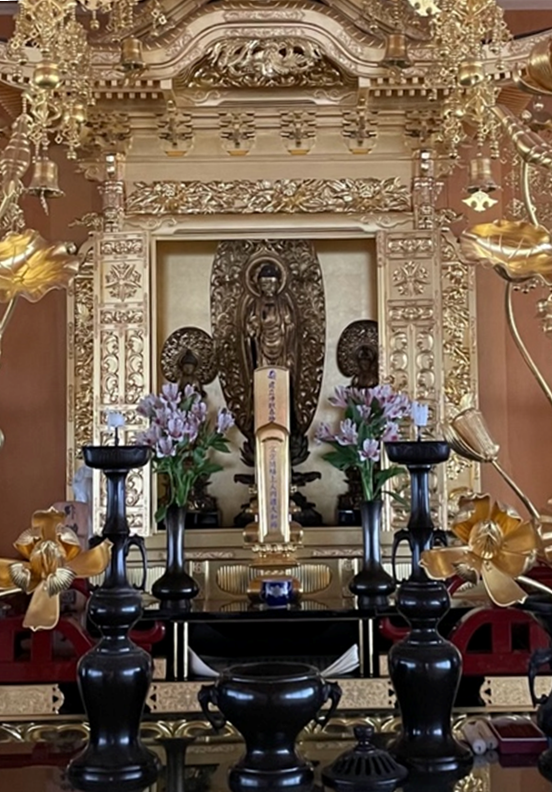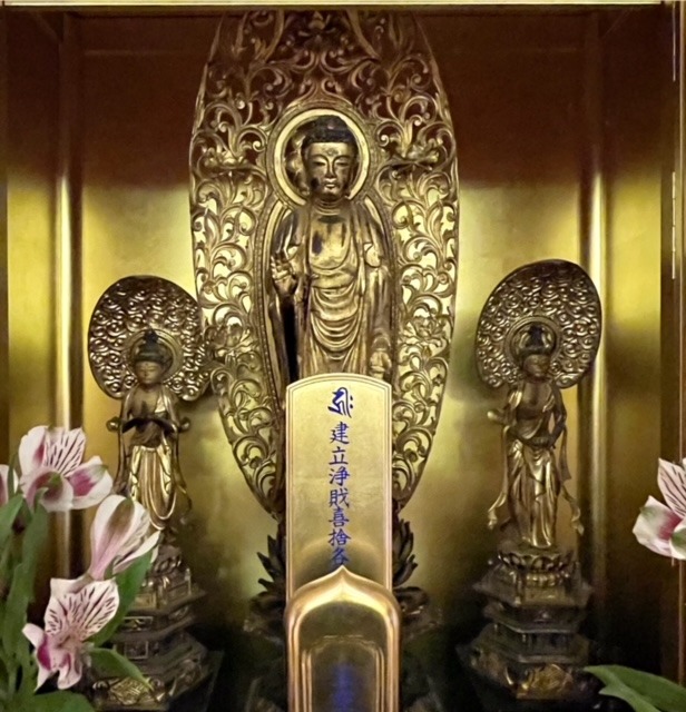 The main figure (gohonzon 御本尊) is the Buddha Amida, who has two different Sanskrit names: Amitāyus (“Immeasurable Life”) and Amitābha (“Immeasurable Light”). While the Buddha Shākyamuni lived in our world at a specific time, the Buddha Amida did not.