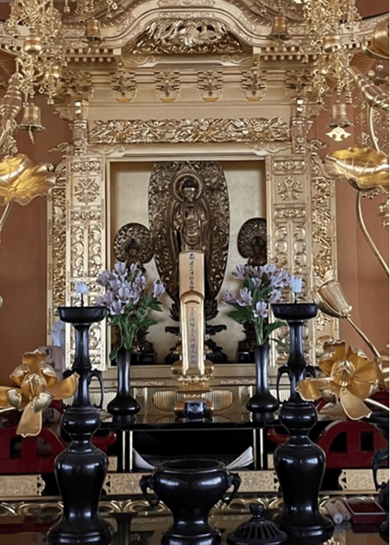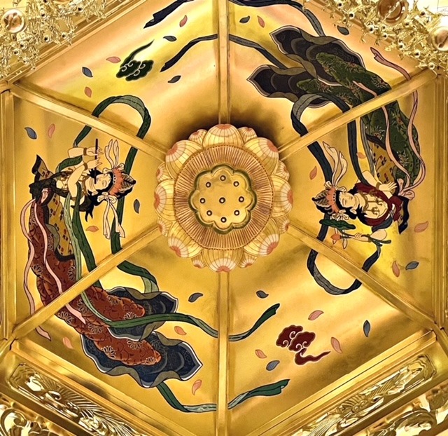 Above the Buddha’s head is a golden canopy, which is called the “heavenly canopy for the Buddha” (buttengai 仏天蓋), while in the center of the room is a larger canopy called the “heavenly canopy for the people” (nintengai人天蓋). Two golden banners hang before the altar and two vases hold large golden lotus flowers.